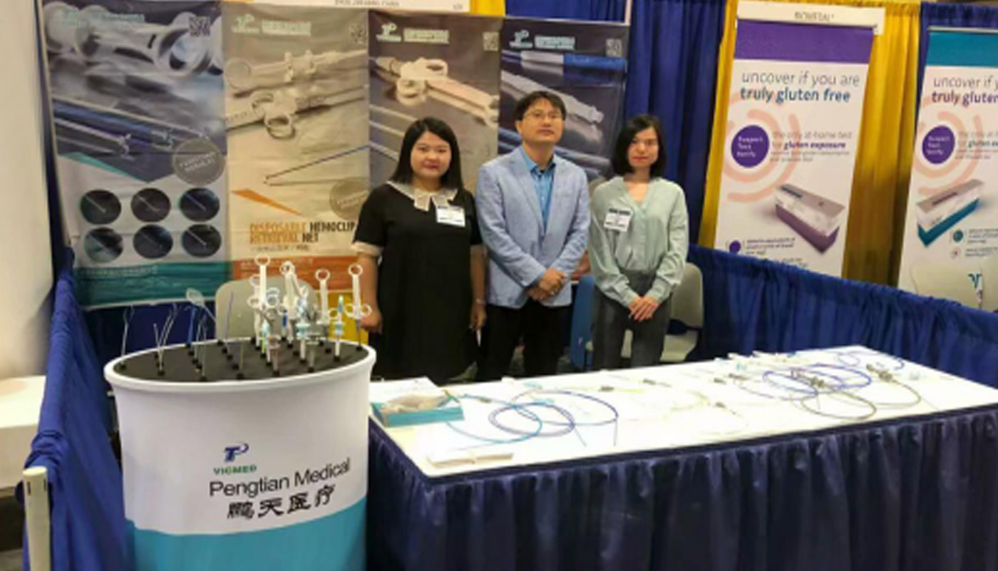 鵬天醫(yī)療器械限公司攜帶單雙側(cè)翻活檢鉗,360°同步旋轉(zhuǎn)圈套器,止血夾,新型異物網(wǎng)兜等產(chǎn)品亮相并且取得圓滿成功。